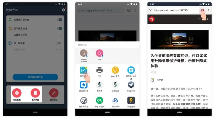 除此之外,截屏大师还支持网页截图和图片拼接功能。用户可在浏览器中通过分享或在 App 中输入网址至截屏大师,待网页加载完毕后,点击界面右上角的「捕捉」按钮即可捕捉网页内容并生成长截图。