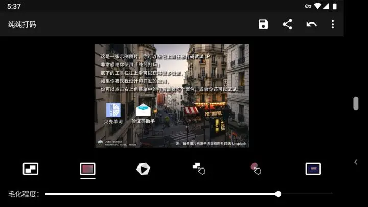 正如其名,纯纯打码是一款专注打码的应用,为我们提供了马赛克、毛玻璃、Low Poly、涂抹马赛克、毛玻璃、高亮等 6 种打码模式。应用整体的界面十分简洁,6 种打码模式都列于下方,并在界面中间提供了一张示例图片,供用户选择模式后进行打码测验效果。