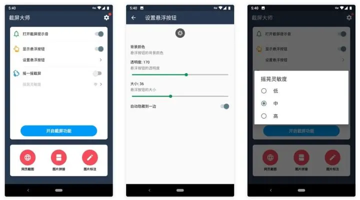 - 摇一摇截屏:摇晃手机即可截屏,可设置高、中、低三个等级的摇晃灵敏度