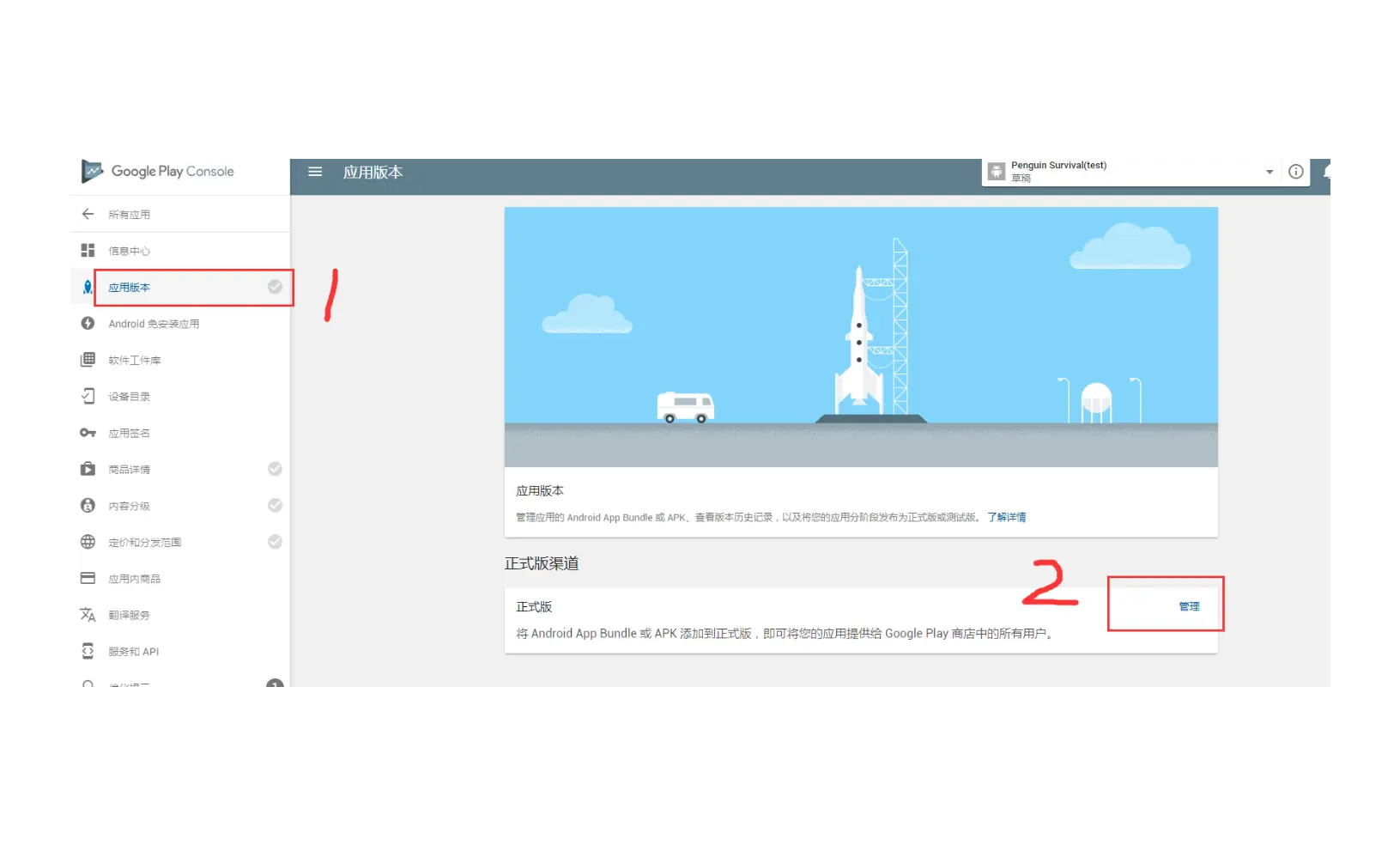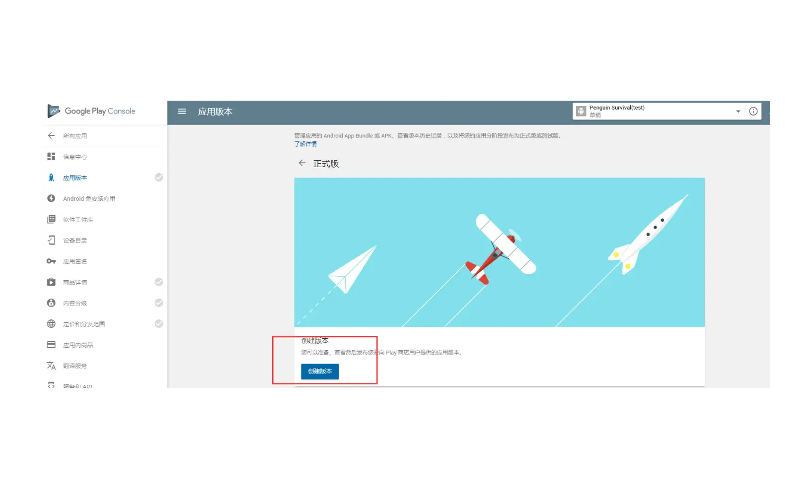 点击左边的"应用版本",再点击"管理",在新页面中点击"创建版本",打开apk上传页面。如下图