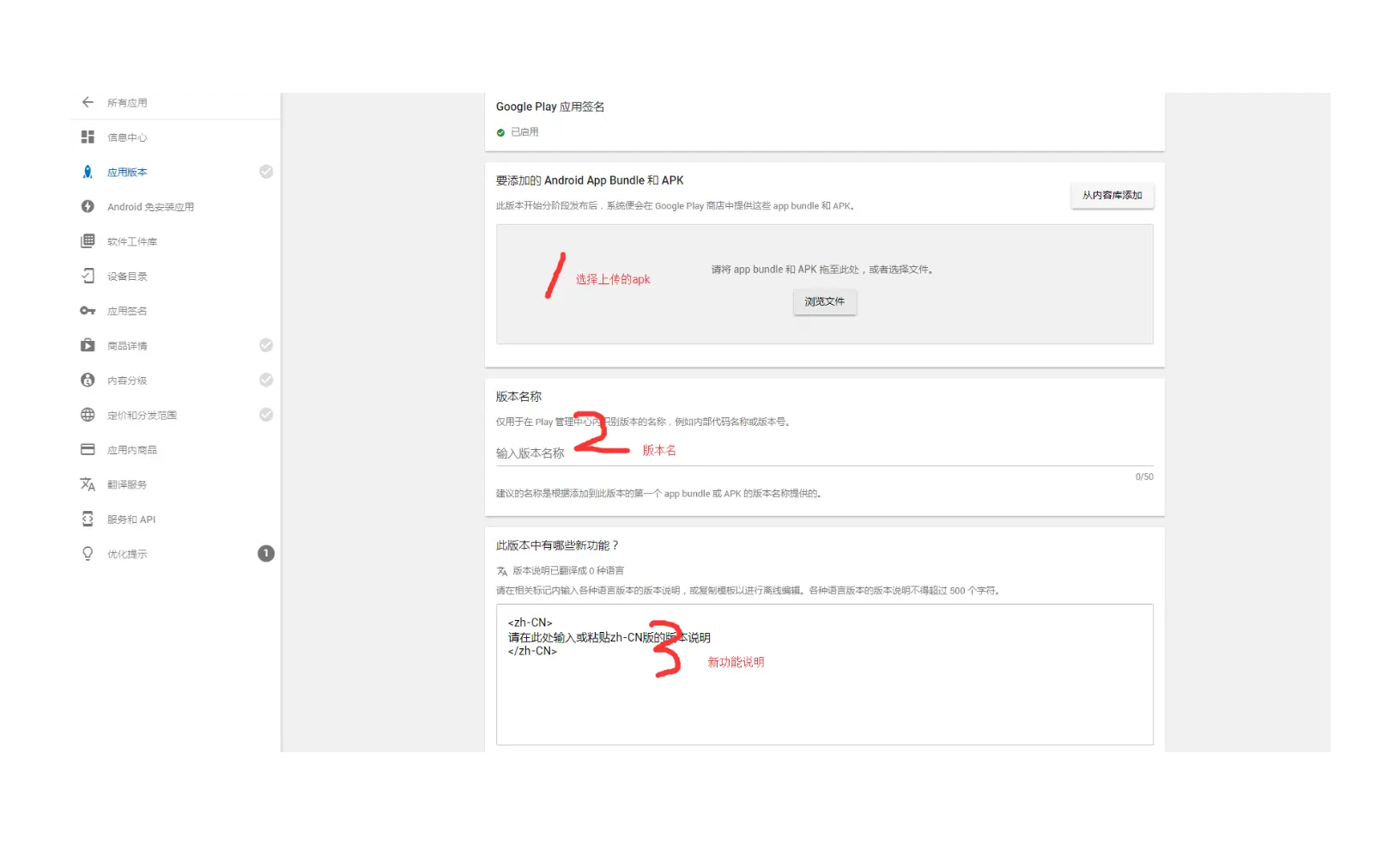 Google Play 应用签名应用签名中点击继续;选择浏览文件上传apk,apk上传完成后,在版本名称中会自动写入版本名,版本名可使用自动填入的版本名,不需要修改;此版本中有哪些功能输入框中,如果是第一次上传,可输入游戏的一句话简介,如果非第一次上传,可输入游戏更新的内容,最后点保存。如下图: