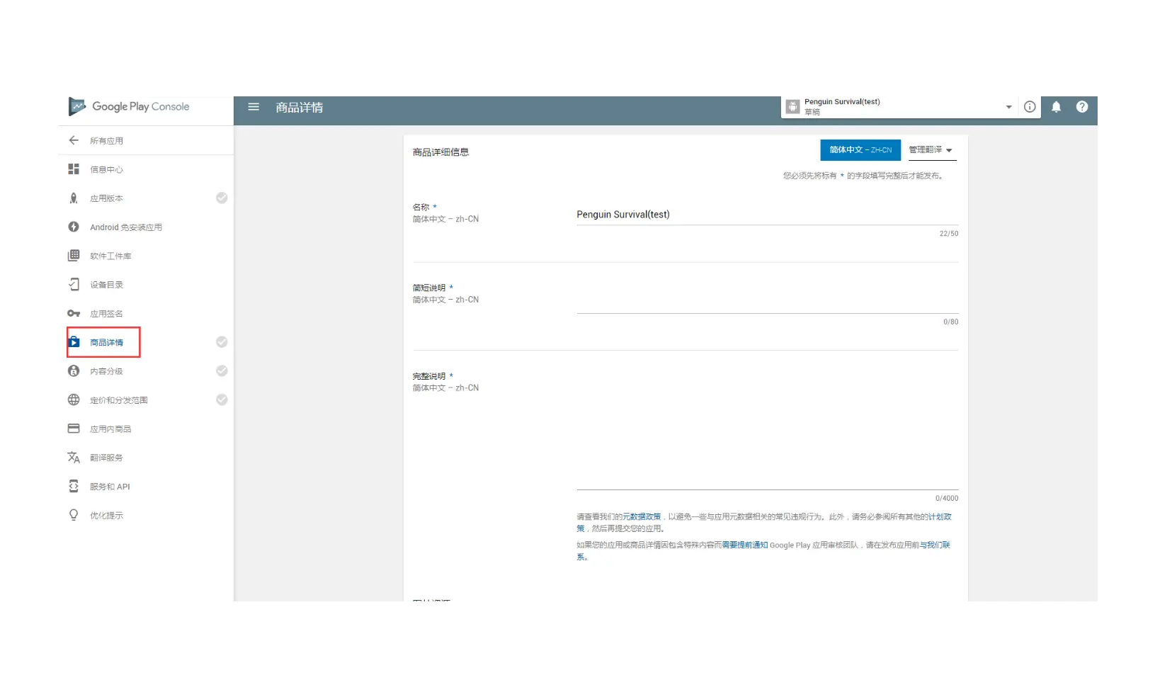 点击屏幕左边的商品详情,打开商品详情输入页面,一次填入相关信息。其中电子邮件地址请改为客服联系邮件地址;隐私权政策需要输入隐私权政策网页,隐私权网页可在这个网页免费生成(www.freeprivacypolicy.com);商品详细页面图示: