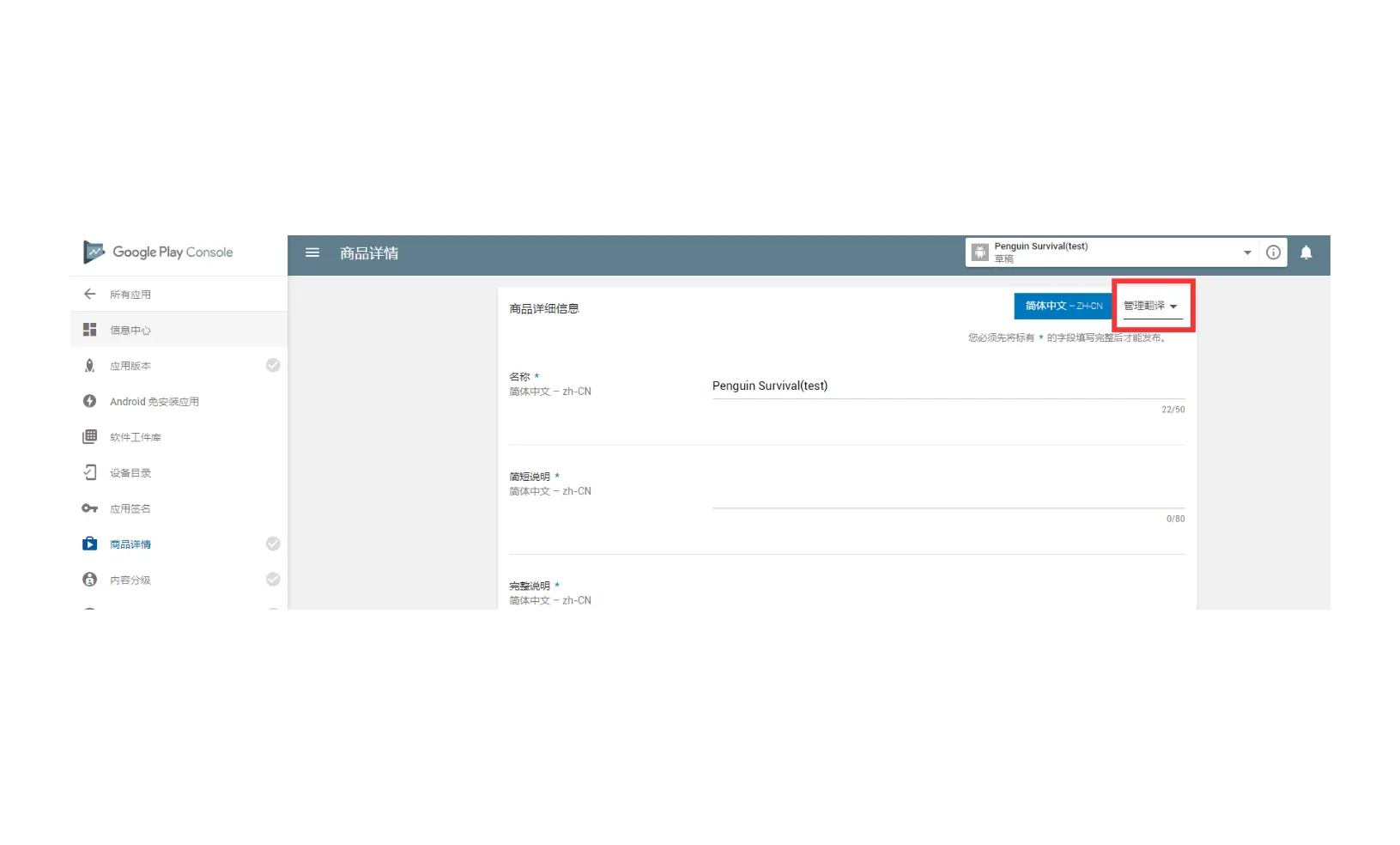 在商品详情页面右上角点击管理翻译-->添加您自己的翻译文本,可添加不同的语言版本。如下图: