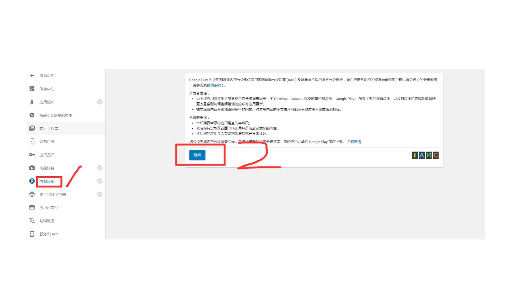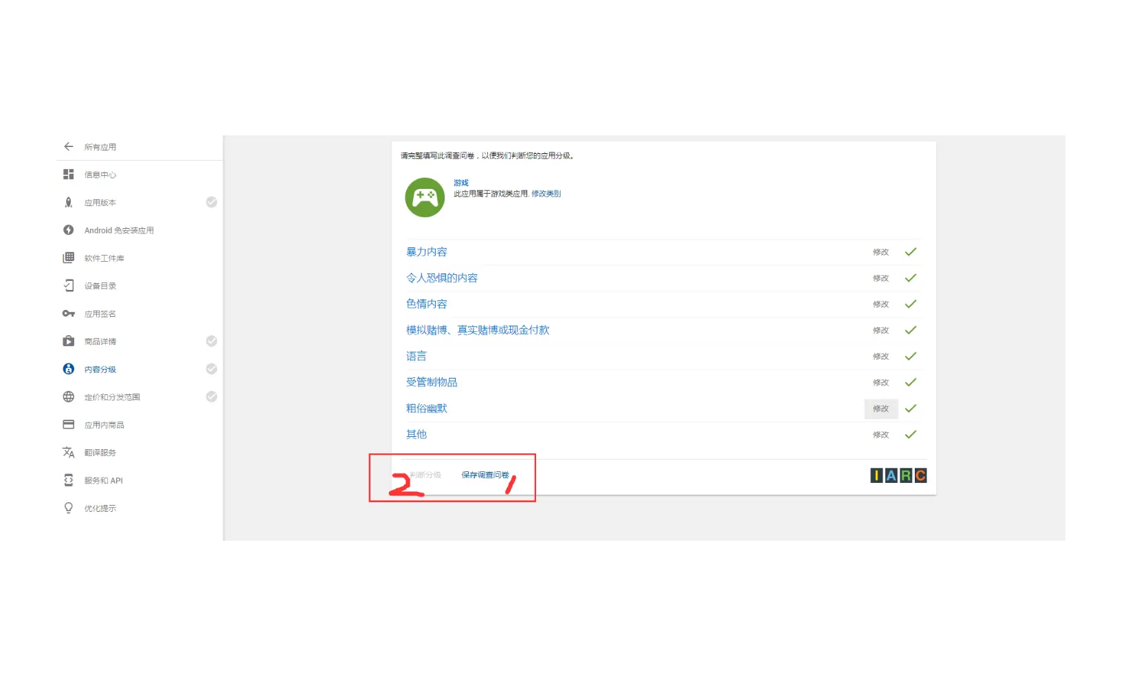 点击左边内容分级,点继续按钮,输入邮箱地址,选择app类别,进入分级答题页面,如下图: