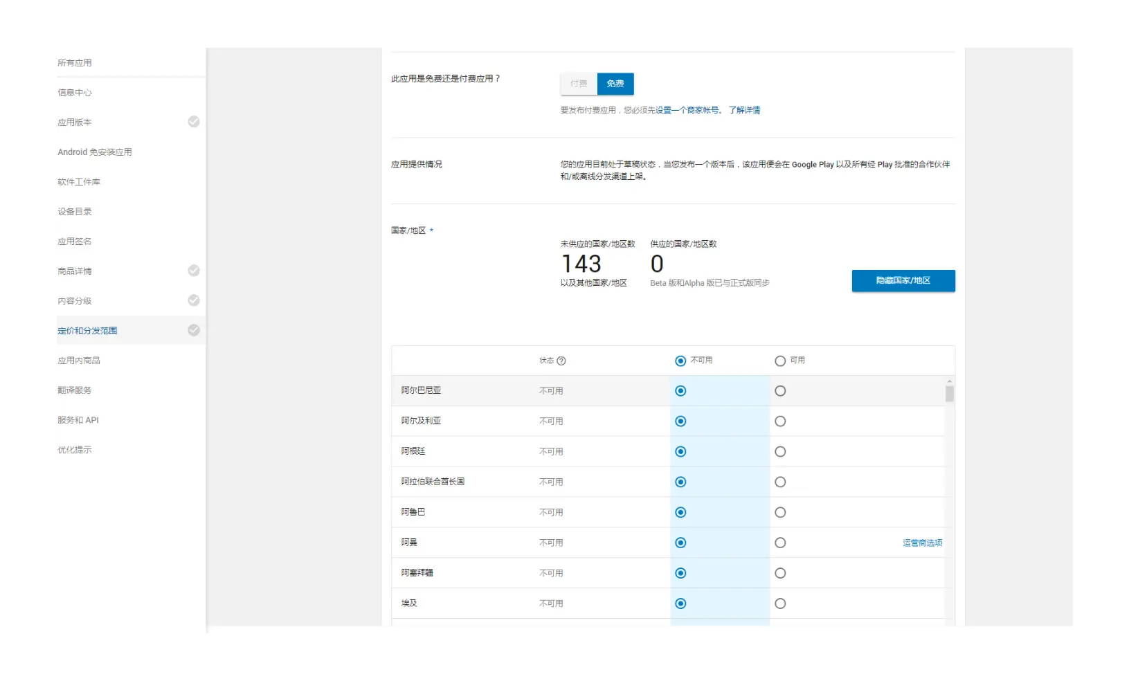 点击左边的定价和分发范围,打开定价分发范围页面,依次填写相关内容后保存。个人帐号只能发布免费应用,企业帐号才可以发布收费应用。
