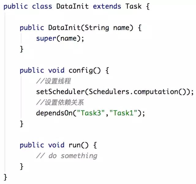 (2) 初始化:有些组件有在应用启动时初始化服务的需求,而且很多服务还是有依赖关系的,最初我们为每个组件都添加了一个 init() 方法,但是并不能解决依赖顺序问题,需要每个组件都在 app 工程中按顺序添加初始化代码才能正常运行,这使得不熟悉整套组件业务的人很难建立起一个可以独立运行的组件 app。因此我们开发了一套多线程初始化框架,每个组件只要新建若干个启动 Task 类,并在 Task 中声明依赖关系即可: