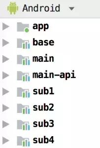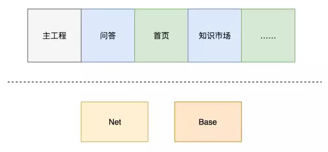 各个子业务线分别拆成同一个工程中不同的 Module:它们共同依赖 base ,同时各个业务线互相不依赖,这些子业务又在一个主 Module 中汇集起来,正如上面图片所示那样