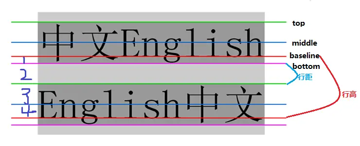 由图片可以清晰地看出,行高是baseline之前的距离,而行距是bottom-top之间的距离,行高-行距=1+3+4=字体大小。而行距是一半字体分布在下边,一半分布在字体上边,且均匀分布,所以就达到了垂直居中的效果。