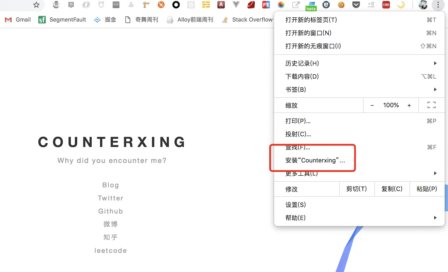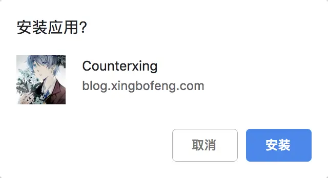 此时,进入一个支持PWA的网站(例如Google I/O),在Chrome浏览器右上角,点击安装。即可安装到桌面。这里以我的博客为例: