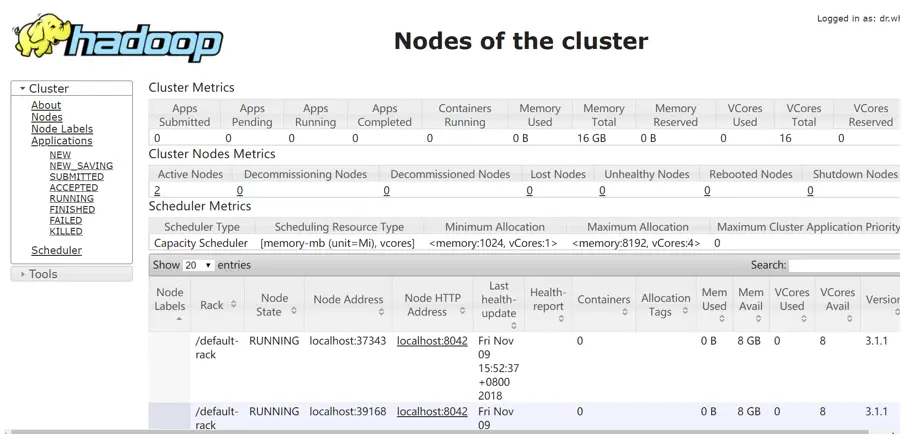 yarn jar /home/dc2-user/hadoop-3.1.1/share/hadoop/mapreduce/hadoop-mapreduce-examples-3.1.1.jar wordcount /input /output WARNING: YARN_CONF_DIR has been replaced by HADOOP_CONF_DIR. Using value of YARN_CONF_DIR. 2018-11-09 20:27:12,233 INFO client.RMProxy: Connecting to ResourceManager at master/10.254.149.24:8032 2018-11-09 20:27:12,953 INFO mapreduce.JobResourceUploader: Disabling Erasure Coding for path: /tmp/hadoop-yarn/staging/root/.staging/job_1541766351311_0001 2018-11-09 20:27:14,483 INFO input.FileInputFormat: Total input files to process : 2 2018-11-09 20:27:16,967 INFO mapreduce.JobSubmitter: number of splits:2 2018-11-09 20:27:17,014 INFO Configuration.deprecation: yarn.resourcemanager.system-metrics-publisher.enabled is deprecated. Instead, use yarn.system-metrics-publisher.enab 2018-11-09 20:27:17,465 INFO mapreduce.JobSubmitter: Submitting tokens for job: job_1541766351311_0001 2018-11-09 20:27:17,466 INFO mapreduce.JobSubmitter: Executing with tokens: [] 2018-11-09 20:27:17,702 INFO conf.Configuration: resource-types.xml not found 2018-11-09 20:27:17,703 INFO resource.ResourceUtils: Unable to find 'resource-types.xml'. 2018-11-09 20:27:18,256 INFO impl.YarnClientImpl: Submitted application application_1541766351311_0001 2018-11-09 20:27:18,296 INFO mapreduce.Job: The url to track the job: http://master:8088/proxy/application_1541766351311_0001/ 2018-11-09 20:27:18,297 INFO mapreduce.Job: Running job: job_1541766351311_0001 2018-11-09 20:28:24,929 INFO mapreduce.Job: Job job_1541766351311_0001 running in uber mode : false 2018-11-09 20:28:24,931 INFO mapreduce.Job: map 0% reduce 0% 2018-11-09 20:28:58,590 INFO mapreduce.Job: map 50% reduce 0% 2018-11-09 20:29:19,437 INFO mapreduce.Job: map 100% reduce 0% 2018-11-09 20:29:33,038 INFO mapreduce.Job: map 100% reduce 100% 2018-11-09 20:29:36,315 INFO mapreduce.Job: Job job_1541766351311_0001 completed successfully 2018-11-09 20:29:36,619 INFO mapreduce.Job: Counters: 54 File System Counters FILE: Number of bytes read=75 FILE: Number of bytes written=644561 FILE: Number of read operations=0 FILE: Number of large read operations=0 FILE: Number of write operations=0 HDFS: Number of bytes read=237 HDFS: Number of bytes written=31 HDFS: Number of read operations=11 HDFS: Number of large read operations=0 HDFS: Number of write operations=2 Job Counters Killed map tasks=1 Launched map tasks=3 Launched reduce tasks=1 Data-local map tasks=3 Total time spent by all maps in occupied slots (ms)=164368 Total time spent by all reduces in occupied slots (ms)=95475 Total time spent by all map tasks (ms)=82184 Total time spent by all reduce tasks (ms)=31825 Total vcore-milliseconds taken by all map tasks=82184 Total vcore-milliseconds taken by all reduce tasks=31825 Total megabyte-milliseconds taken by all map tasks=168312832 Total megabyte-milliseconds taken by all reduce tasks=97766400 Map-Reduce Framework Map input records=5 Map output records=8 Map output bytes=78 Map output materialized bytes=81 Input split bytes=190 Combine input records=8 Combine output records=6 Reduce input groups=4 Reduce shuffle bytes=81 Reduce input records=6 Reduce output records=4 Spilled Records=12 Shuffled Maps =2 Failed Shuffles=0 Merged Map outputs=2 GC time elapsed (ms)=2230 CPU time spent (ms)=2280 Physical memory (bytes) snapshot=756064256 Virtual memory (bytes) snapshot=10772656128 Total committed heap usage (bytes)=541589504 Peak Map Physical memory (bytes)=281268224 Peak Map Virtual memory (bytes)=3033423872 Peak Reduce Physical memory (bytes)=199213056 Peak Reduce Virtual memory (bytes)=4708827136 Shuffle Errors BAD_ID=0 CONNECTION=0 IO_ERROR=0 WRONG_LENGTH=0 WRONG_MAP=0 WRONG_REDUCE=0 File Input Format Counters Bytes Read=47 File Output Format Counters Bytes Written=31 |