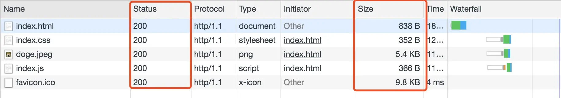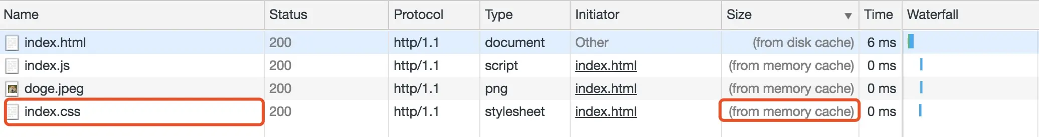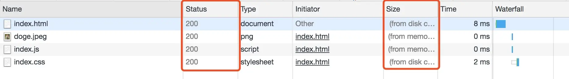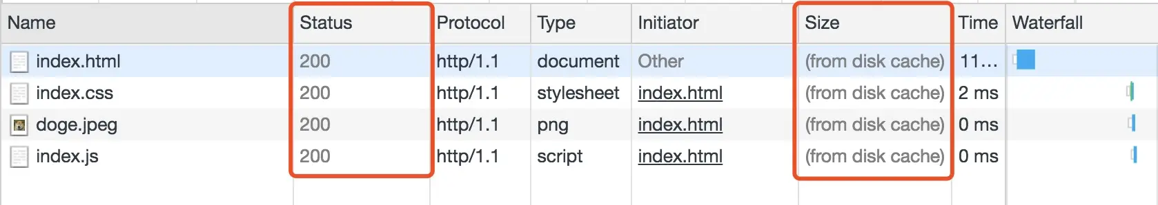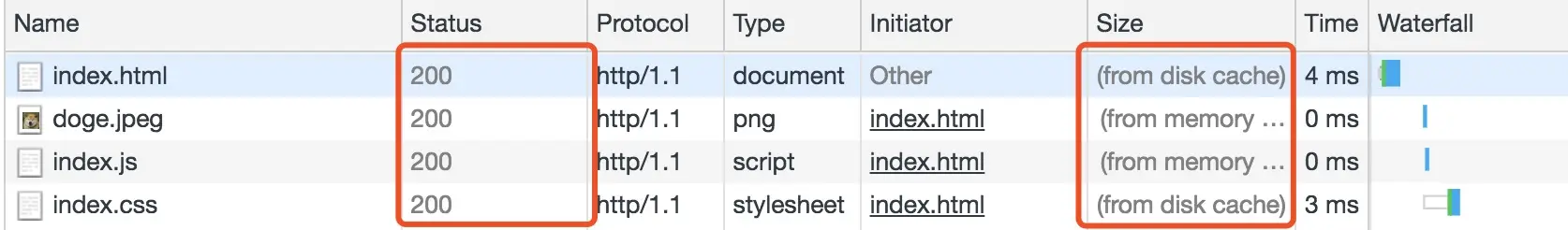 状态码为灰色的请求则代表使用了强制缓存,请求对应的Size值则代表该缓存存放的位置