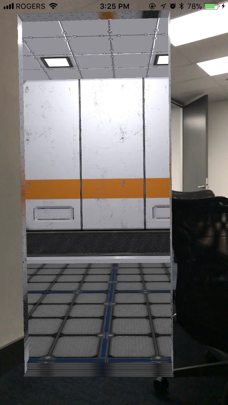 - 从outerSurface几何体创建一个SCNNode对象.设置节点的renderingOrder(渲染顺序) 为10.节点的渲染顺序值越大就渲染得越晚.为了让地板和天花板从时空门外面不可见,你将需要使内部的天花板和地板节点的渲染顺序远大于10.
