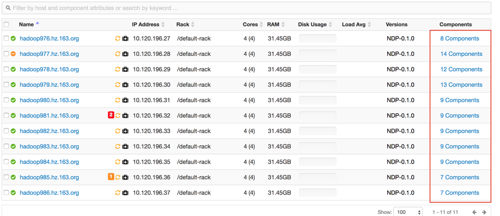 15. Impala:待补充组件的种类大致有15类,每个组件各自有自己的多个服务需要部署,并且其中大部分(80%以上)的服务都是集群式地多节点部署以支持高可用/负载均衡。从我们测试环境的Ambari管理页面上看下我们具体部署的组件数量: