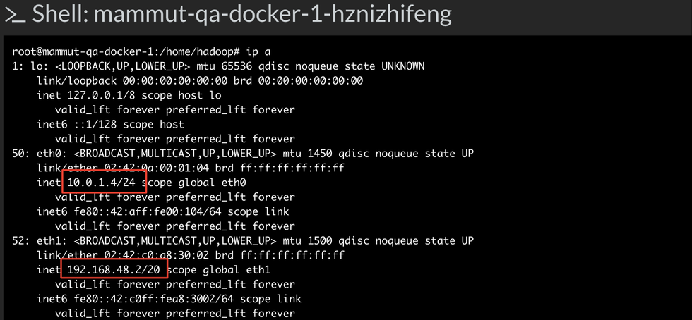 为了解决上述问题,在我们的镜像制作过程中,采取了固定hostname的方式。为每个容器加上特定的hostname(mammut-qa-docker-1.server.org~mammut-qa-docker-8.server.org),这样在任何需要配置服务依赖的地方,我们可以直接填写对端服务的hostname。而容器之间的通信,我们为每套大数据环境,创建一个特定的私有网络(network),将同一套环境的容器挂载到同一个特定网络下,这样每个容器会被分配到一个私有ip,同一个私有网络下的私有ip之间是互通的。然后通过自动化脚本去修改每个容器内部的/etc/hosts文件,添加ip-hostname的映射到容器内部的路由列表中。