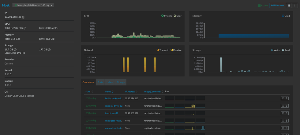 在对业界的一些集群监控工具进行了调研后,最终选择了Rancher(rancher.com/)作为我们的集群管理工具。它可以跟Kubernetes、Swarm等都很好地兼容,并提供了ldap等权限管理的方式,和丰富的管理api。此外它的一大特色就是它的“镜像应用商店”,就好像App Store一样。
