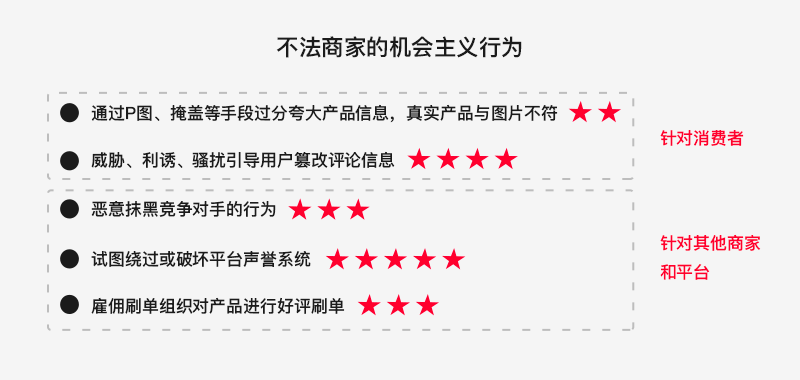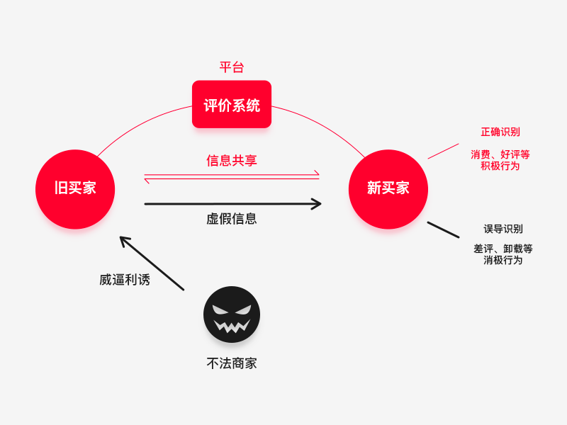 平台通过评价系统让旧买家与新买家之间的信息共享,让买家正确识别商品信息,引导新用户达成消费、好评、继续使用平台等积极行为;不法商家为了自身的利益威逼利诱旧卖家捏造虚假信息,导致新用户误导判断商品的好坏,最后收到劣质产品的用户会进行差评、卸载平台等消极行为,此类不明智短期的利益买卖,对用户和平台两边造成的伤害都很严重。