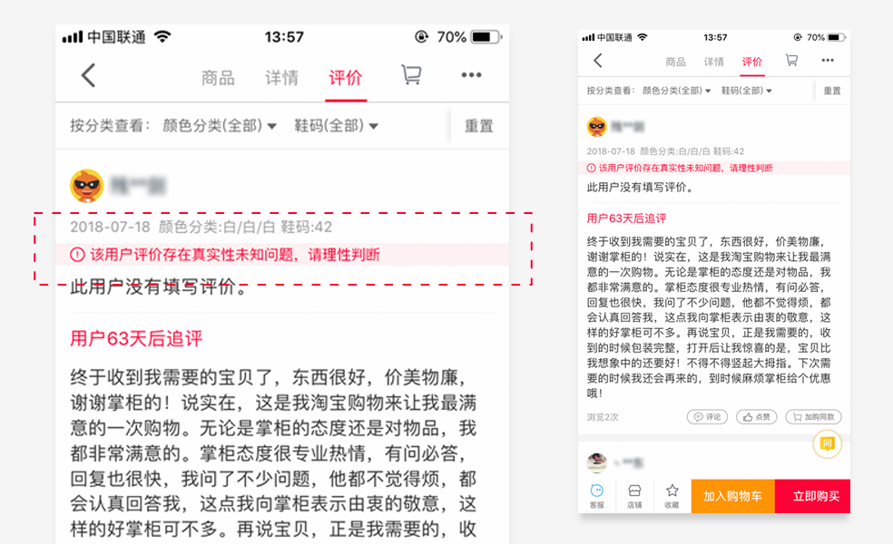 通过在一些存在疑问的评价前给予用户一定的提示信息,提醒用户理性判断。