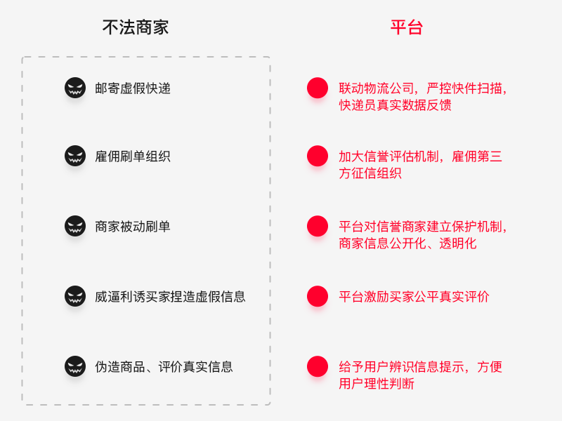 针对商家的刷单行为和动机进行解决方案评估提案,不断完善信誉机制,表现层则需要增设强心智设计对用户营造用户安全感氛围,快速对焦认知,让用户知道自己所身处的场景是安全的、严谨的,是经过严格审核的,让用户安心购物。