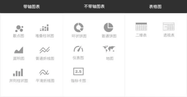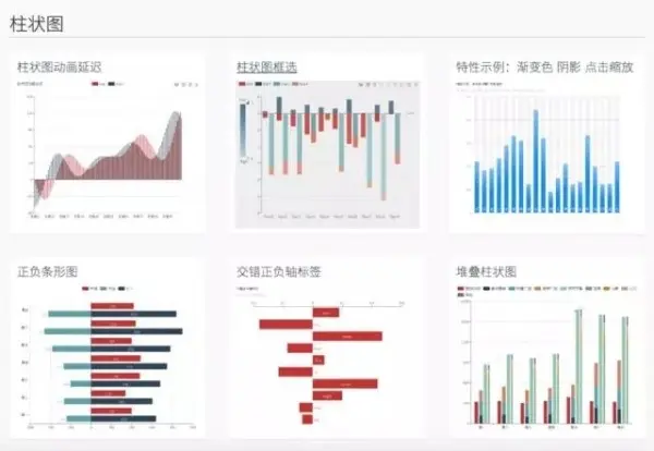 包含最主流的图表类型如柱状图、折线图等;覆盖图表类型最多,可操作内容也最多,交互普适性最广
