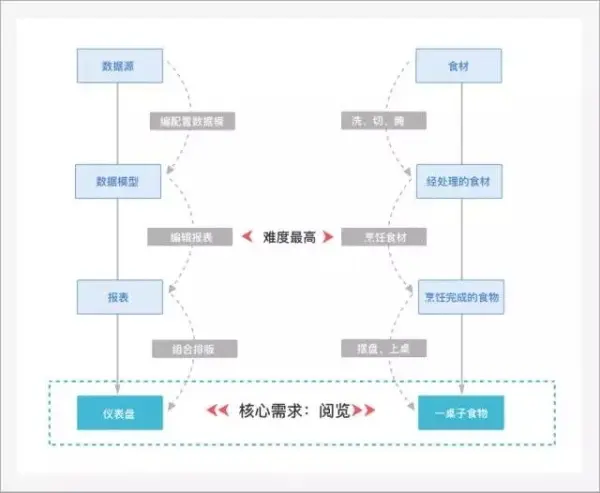 数据源是用来建立数据模型的,把导入的数据进行配置,形成了数据模型,然后通过数据模型中的数据字段绘制报表,把绘制完毕的各个报表拼合成仪表盘,整个流程就结束了。看上去好像很复杂,其实这和做菜的过程非常相似,数据源就是食材,数据模型对应经过处理的食材,编辑报表等同于烹饪食材,最终形成的仪表盘就和烹饪完成端上桌的食物相似。