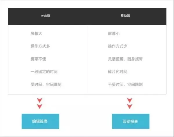 web端能够承载更多的功能,提供更专业的分析操作性,而移动端的特性是轻量级,灵活方便,不受时间空间等限制。对于决策层来说,为了制作一张图表在电脑前待很久的场景非常少见,大部分决策人员应该是在会议室内围着一张已经完成的报表进行讨论和分析,或者在公司以外的地方随时随地监视关键指标的变化,并作出相应的指挥与应对措施。所以,web端的重点是“编辑”,而移动端的重心应该放在“阅览”上。