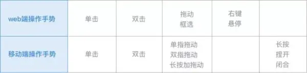 如表:有一些web端的操作手势可以直接在移动端延用,比如单击、双击、拖动,但是有一些web端操作手势在移动端是无法延用的,需要重新设计相对应的手势。具体的操作根据具体的业务来最终确定。