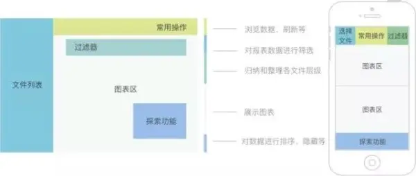 如图所示:图表区主要用以展示报表,占用了面积最大的一块区域,用户通过这一界面来了解自己的业务情况。文件列表区用以归纳和整理各个文件层级,起到规划和导航的作用。过滤器更通俗一点的说法是筛选器,属于使用频率最高的操作之一,方便用户根据不同维度筛选出自己最需要的信息。探索功能使用频率也比较高,但对于用户来说有一定的学习成本,优先级相对低一些。还有一些常用功能辅助用户在浏览报表的过程中提高效率;比如浏览数据、刷新等等。根据web端的模块布局,我们可以尝试着结合用户的操作习惯,在移动端排列大体框架,然后在框架的基础上不断细化和完善设计。