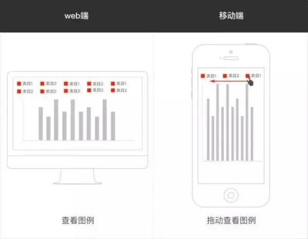 除了图表内的操作,用户还常常还需要通过图例查看不同颜色的数据项各自的名称,一般显示在图表上方,web端屏幕够大,一眼就能够看完,几乎不需要额外操作;但在移动端,即使忽略每个名称的字数长度,看全所有的图例也很难,在这种情况下,我们得允许用户在这个区域横向拖动操作,必要的时候还可以做些操作引导。