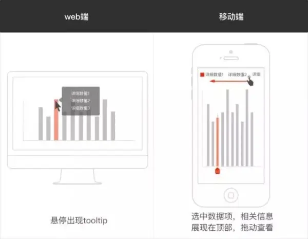 tooltip在web端图表操作中也很常见,当用户hover在某个数据项上时,tooltip中会列出关于这个数据项的详细信息;但在移动端有一些问题,首先,移动端没有hover的操作;其次,一些数据项的详细信息内容很多,很有可能出现一个很大的浮层遮盖住大部分图表,当你在拖动滑块浏览数据信息的时候,这个浮层会随着你的滑动一直存在,影响美观。所以,我们把tooltip内的信息放到屏幕最上方展示,保证浮层不会挡住图表,如果最上方展示不下,允许横向拖动浏览完整详情。
