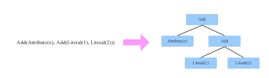 如上图所示,箭头左边表达式有3种数据类型(Literal表示常量、Attribute表示变量、Add表示动作),表示x+(1+2)。映射到右边树状结构后,每一种数据类型就会变成一个节点。另外,Tree还有一个非常重要的特性,可以通过一定的规则进行等价变换,如下图: