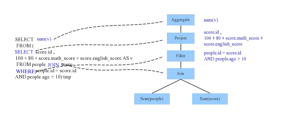 Analyzer会再次遍历整个语法树,对树上的每个节点进行数据类型绑定以及函数绑定,比如people词素会根据元数据表信息解析为包含age、id以及name三列的表,people.age会被解析为数据类型为int的变量,sum会被解析为特定的聚合函数,如下图所示: