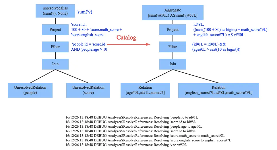 通过解析后的逻辑执行计划基本有了骨架,但是系统并不知道score、sum这些都是些什么鬼,此时需要基本的元数据信息来表达这些词素,最重要的元数据信息主要包括两部分:表的Scheme和基本函数信息,表的scheme主要包括表的基本定义(列名、数据类型)、表的数据格式(Json、Text)、表的物理位置等,基本函数信息主要指类信息。