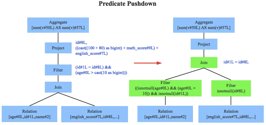 上图左边是经过Analyzer解析后的语法树,语法树中两个表先做join,之后再使用age>10对结果进行过滤。大家知道join算子通常是一个非常耗时的算子,耗时多少一般取决于参与join的两个表的大小,如果能够减少参与join两表的大小,就可以大大降低join算子所需时间。谓词下推就是这样一种功能,它会将过滤操作下推到join之前进行,上图中过滤条件age>0以及id!=null两个条件就分别下推到了join之前。这样,系统在扫描数据的时候就对数据进行了过滤,参与join的数据量将会得到显著的减少,join耗时必然也会降低。