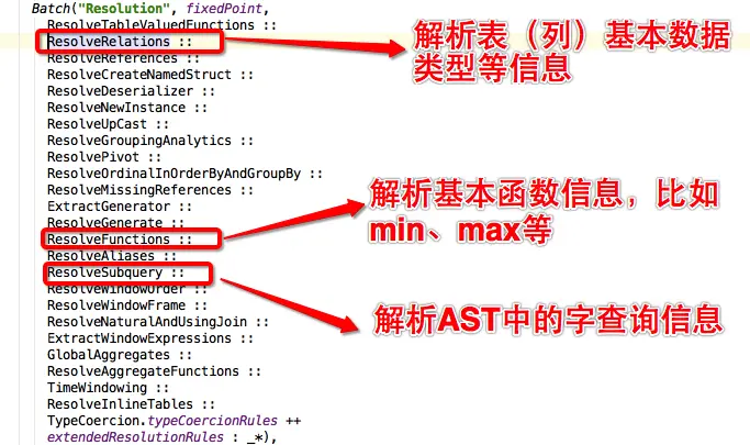 SparkSQL中Analyzer定义了各种解析规则,有兴趣深入了解的童鞋可以查看Analyzer类,其中定义了基本的解析规则,如下: