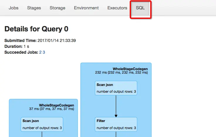 至此,笔者通过一个简单的示例完整的介绍了Catalyst的整个工作流程,包括Parser阶段、Analyzer阶段、Optimize阶段以及Physical Planning阶段。有同学可能会比较感兴趣Spark环境下如何查看一条具体的SQL的整个过程,在此介绍两种方法: