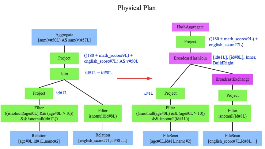 至此,逻辑执行计划已经得到了比较完善的优化,然而,逻辑执行计划依然没办法真正执行,他们只是逻辑上可行,实际上Spark并不知道如何去执行这个东西。比如Join只是一个抽象概念,代表两个表根据相同的id进行合并,然而具体怎么实现这个合并,逻辑执行计划并没有说明。