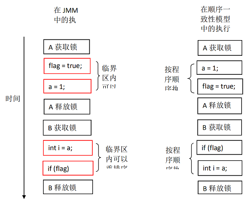 }上面示例代码中,假设 A 线程执行 writer()方法后,B 线程执行 reader()方法。这是一个正确同步的多线程程序。根据 JMM 规范,该程序的执行结果将与该程序在顺序一致性模型中的执行结果相同。下面是该程序在两个内存模型中的执行时序对比图: