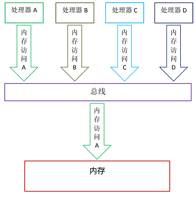 如上图所示,假设处理器 A,B 和 C 同时向总线发起总线事务,这时总线仲裁(bus arbitration)会对竞争作出裁决,这里我们假设总线在仲裁后判定处理器 A 在竞争中获胜(总线仲裁会确保所有处理器都能公平的访问内存)。此时处理器 A 继续它的总线事务,而其它两个处理器则要等待处理器 A 的总线事务完成后才能开始再次执行内存访问。假设在处理器 A 执行总线事务期间(不管这个总线事务是读事务还是 写事务),处理器 D 总线发起了总线事务,此时处理器 D 的这个请求会被总线禁止。