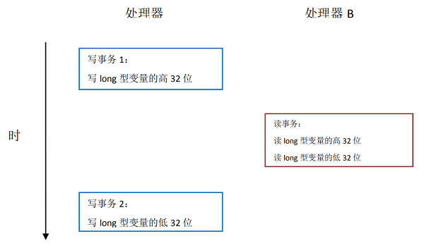 如上图所示,假设处理器 A 写一个 long 型变量,同时处理器 B 要读这个 long 型变量。处理器 A 中 64 位的写操作被拆分为两个 32 位的写操作,且这两个 32 位的