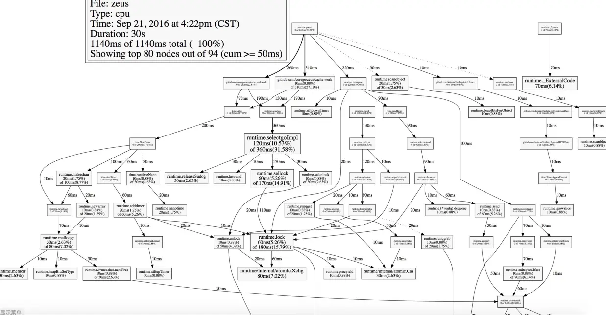 下面附上Go自带的标准profile工具生成的图(在本地对远程的服务器进行profile),只需一行命令即可: 1、系统中各个函数的调用关系和CPU时间分布图: