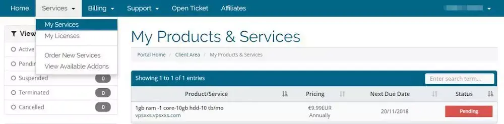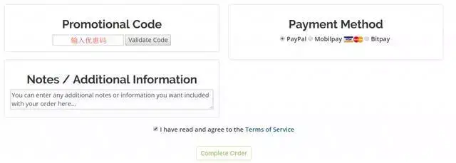 接下来可以输入优惠码(如果有),选择支付方式,可以看到支持paypal,同意注册协议,点击绿色的Complete Order进行支付就可以了。接着在后台首页导航选择Services下拉的My Services就可以看到自己的VPS了: