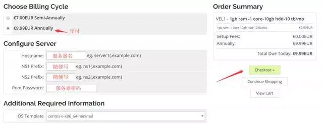 接下来是完善服务器信息,这里选择年付,服务器名和DNS名都随便写,字母即可,服务器密码要记住,最好数字+字母大小写+特殊符号都有,OS Template这里选择自己用的顺手的系统,然后点击右侧的checkout: