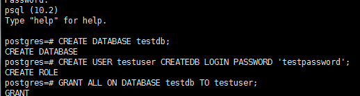 CREATE USER testuser CREATEDB LOGIN PASSWORD 'testpassword';