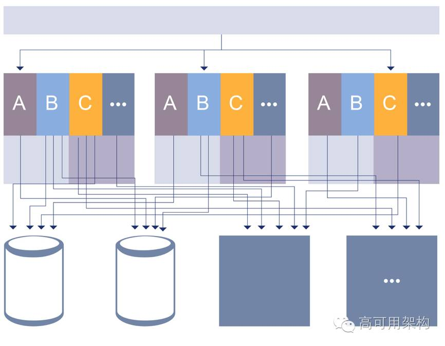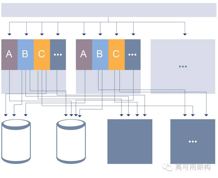 跟大部分公司的架构演进历史非常相似,当上个版本遇到一些性能问题后,最简单就做一些拆分。优化的过程中,那一块太重了就从代码上进行拆分。上图中,A、B 和 C 是不同的业务,刚开始代码是一起的,演进的过程中,迭代一年或者两年的产品,异构去拆其实挺痛苦。