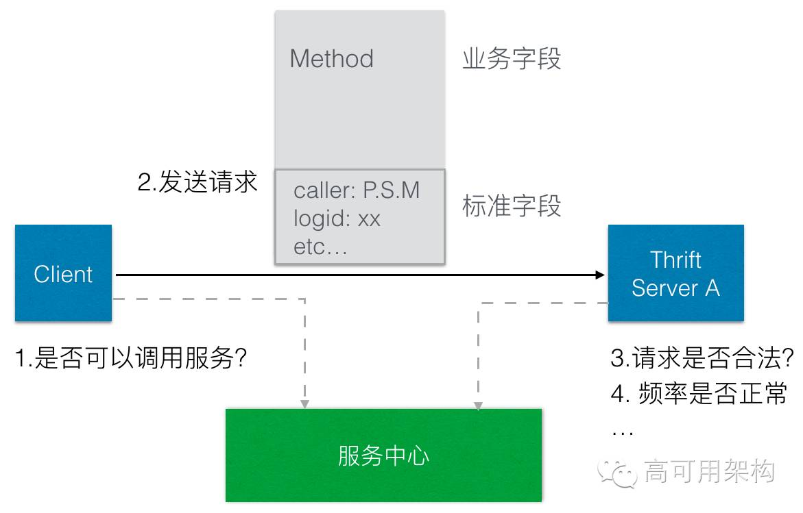 举一个 Thrift 的例子。这两边有两个虚线,服务中心水平扩展能力很强,向它要基本授权的信息,我可不可以调这个服务?默认是可以,就是一个 Thrift 包,我知道你是谁,自己做策略,服务包带过来。请求带上来,分析调用是不是有问题,这也是规范的一部分。开发的同学是不用关心框架这边如何做的。