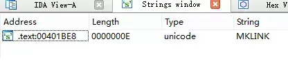 简单搜索了下系统目录,发现并没有 mklink 文件,因此怀疑 mklink 是 cmd 的内置命令。验证这个想法很简单,直接把 cmd 拖入 IDA,搜索相关字符串(mklink),果然: