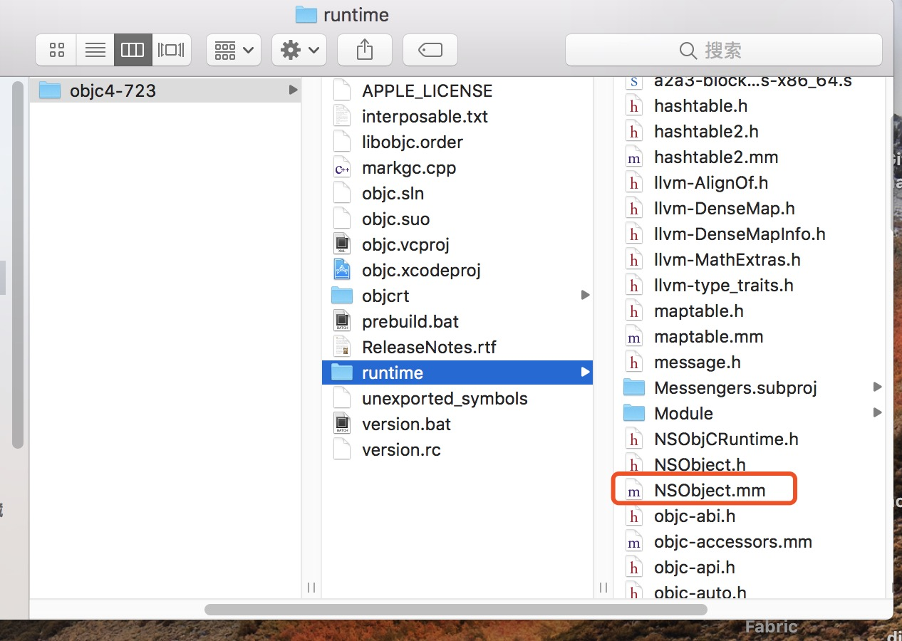 这里说一下怎么下载runtime源码:先打开这个网址opensource.apple.com/,然后选择你电脑对应的macOS版本,目前我电脑是10.13.6,然后com+F搜索objc4,我这里搜到的是objc4-723,点击下载。打开之后的目录是这样的: