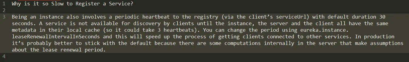 作为实例还涉及到与注册中心的周期性心跳,默认持续时间为30秒(通过serviceUrl)。在实例、服务器、客户端都在本地缓存中具有相同的元数据之前,服务不可用于客户端发现(所以可能需要3次心跳)。你可以使用eureka.instance.leaseRenewalIntervalInSeconds 配置,这将加快客户端连接到其他服务的过程。在生产中,最好坚持使用默认值,因为在服务器内部有一些计算,他们对续约做出假设。