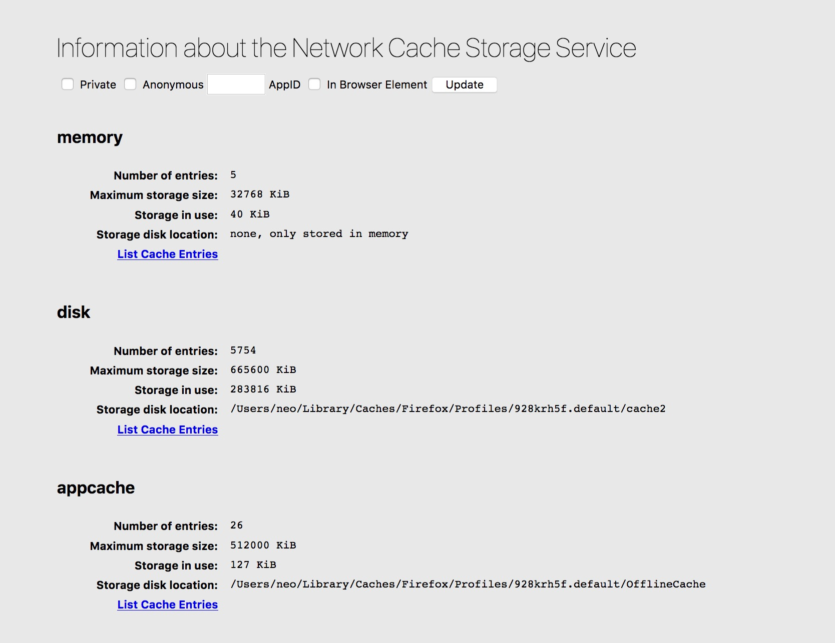 如图上所示,这里我们可以看到浏览器关于网络请求缓存的一些信息。我们以本地磁盘中的为例子。