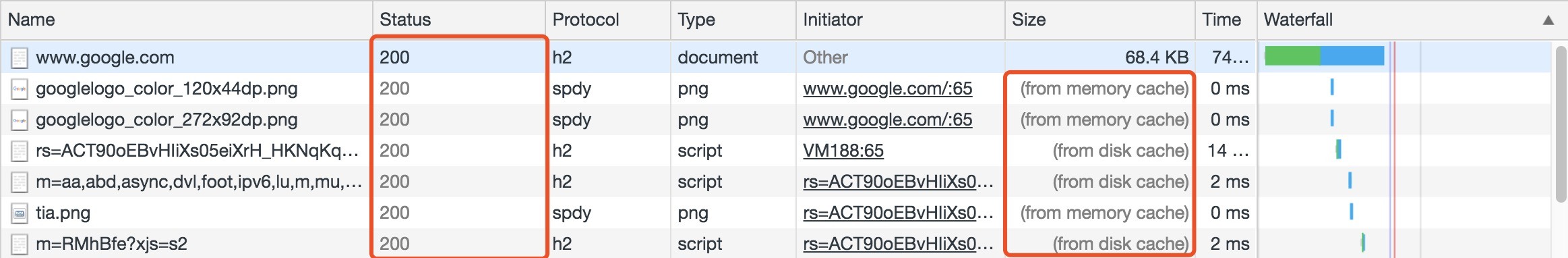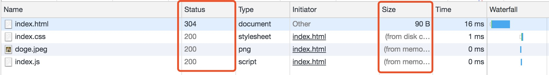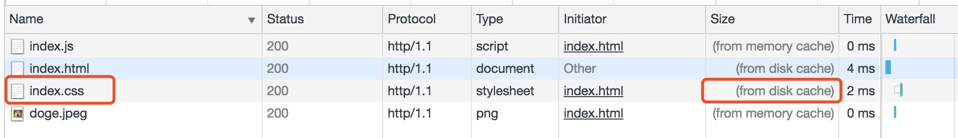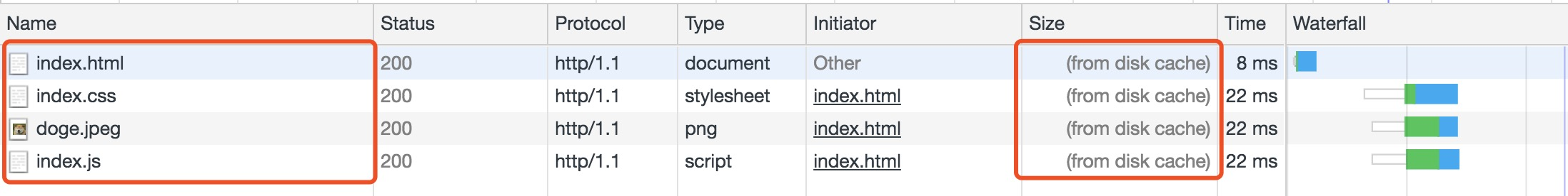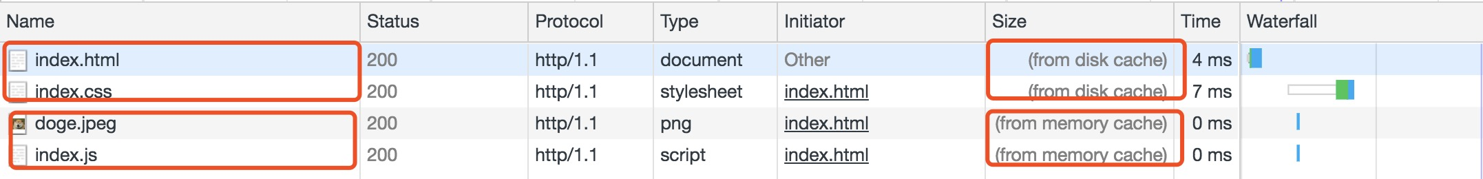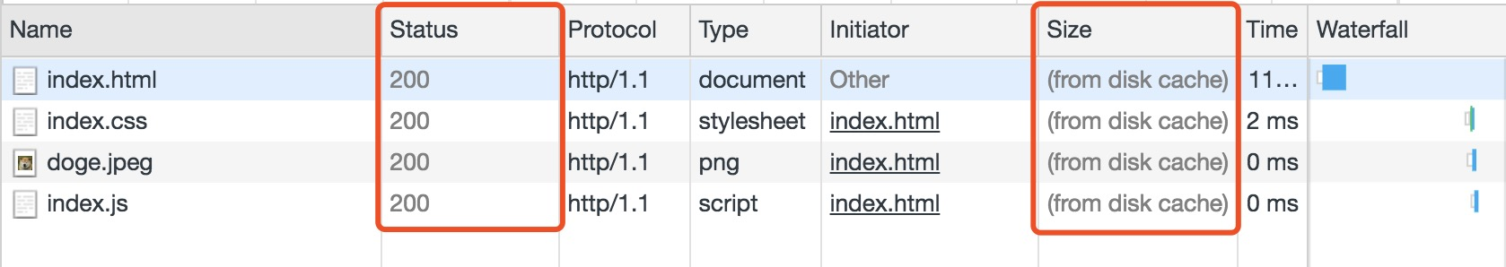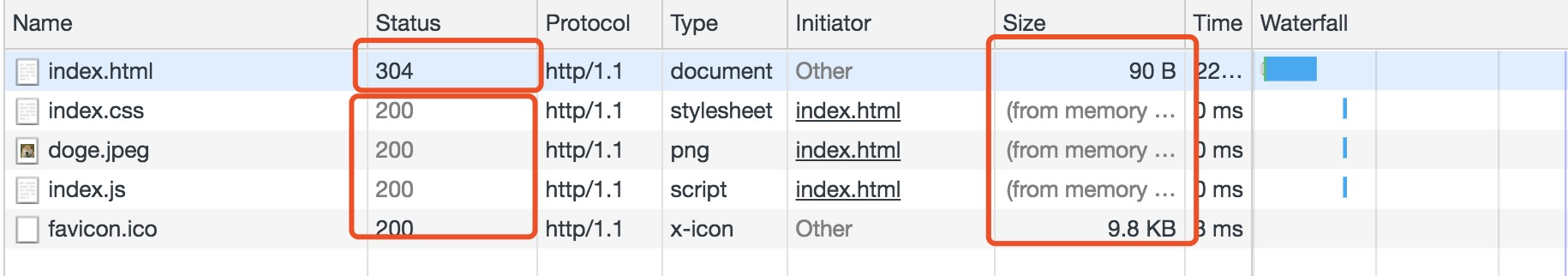 状态码为灰色的请求则代表使用了强制缓存,请求对应的Size值则代表该缓存存放的位置